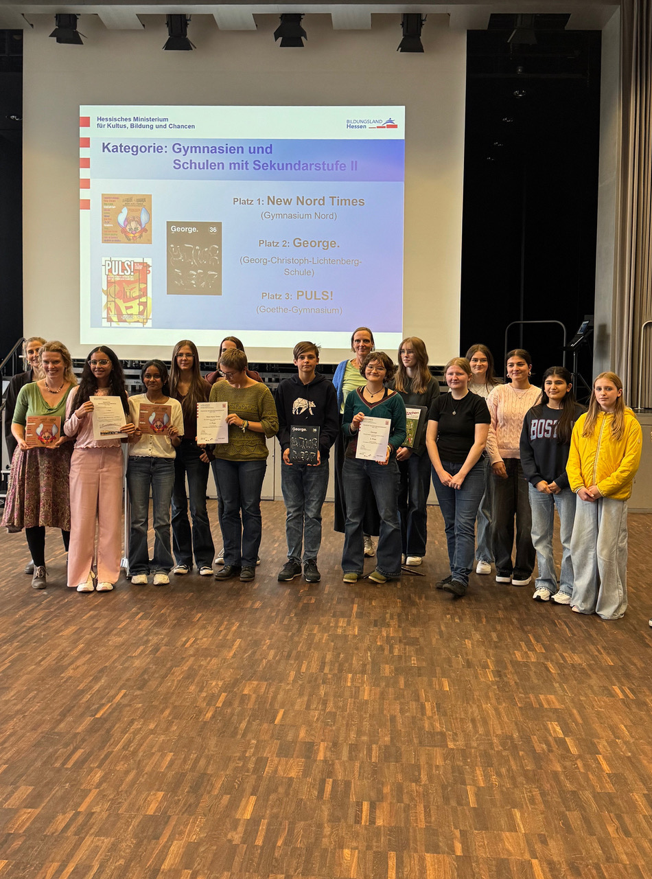 Der George. hat den zweiten Platz beim Hessischen Schülerzeitungswettbewerb gewonnen. „Ich freue mich wahnsinnig, dass wir mit unserer kreativen Arbeit jetzt schon das zweite Mal in Folge so erfolgreich sind“, sagt Chefredakteurin Ronja Reinstädt aus der elften Klasse, die bereits im letzten Jahr dabei war, als der George. ebenfalls ausgezeichnet wurde.