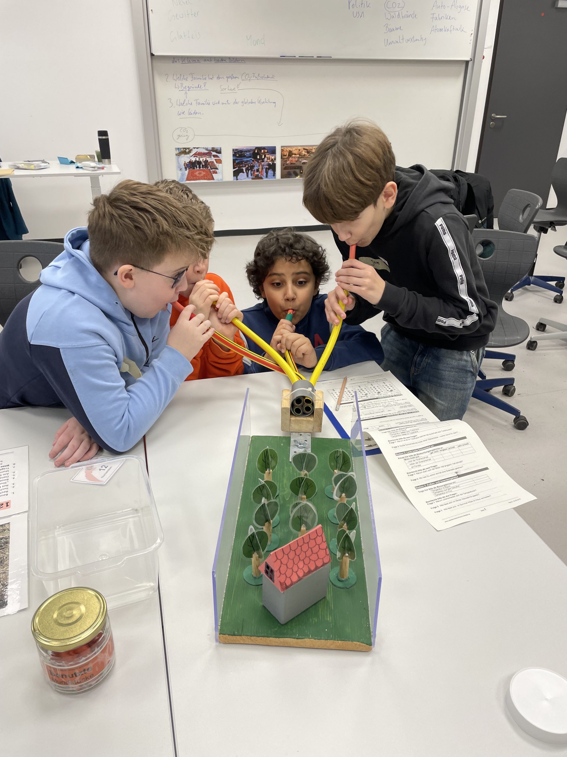Ein besonderes Highlight der Woche war die Lernwerkstatt Klimawandel, die von Kerstin Linne und Lennart Schenuit von Energie2000 durchgeführt wurde. Mit viel Engagement, Fachwissen und abwechslungsreichen Methoden vermittelten sie komplexe Inhalte zum Klimawandel, den daraus folgenden Änderungen für uns und wie wir darauf reagieren können. Im Sinne einer Bildung für nachhaltige Entwicklung (BNE) wurden auch die Handlungsoptionen in den Blick genommen, sowohl die Anpassung an die Folgen des Klimawandels, als auch ganz konkret mögliche Energiesparmaßnahmen in der Schule. Die Schülerinnen und Schüler arbeiteten mit großer Begeisterung mit und hatten sichtbar Freude daran, sich aktiv mit Ursachen, Folgen und Handlungsmöglichkeiten im Zusammenhang mit dem Klimawandel auseinanderzusetzen. Die positive Lernatmosphäre und der hohe Mitmachanteil machten diesen Baustein zu einem besonderen Erlebnis für alle Beteiligten. Ergänzend schauten die Kinder sich begeistert die vom Klimarat des Staatstheaters Kassel entwickelte begehbare Installation (E) Mission Wohnung an, bei der ganz plastisch ressourcensparendes Verhalten in den eigenen vier Wänden eindrücklich erlebbar wurde.