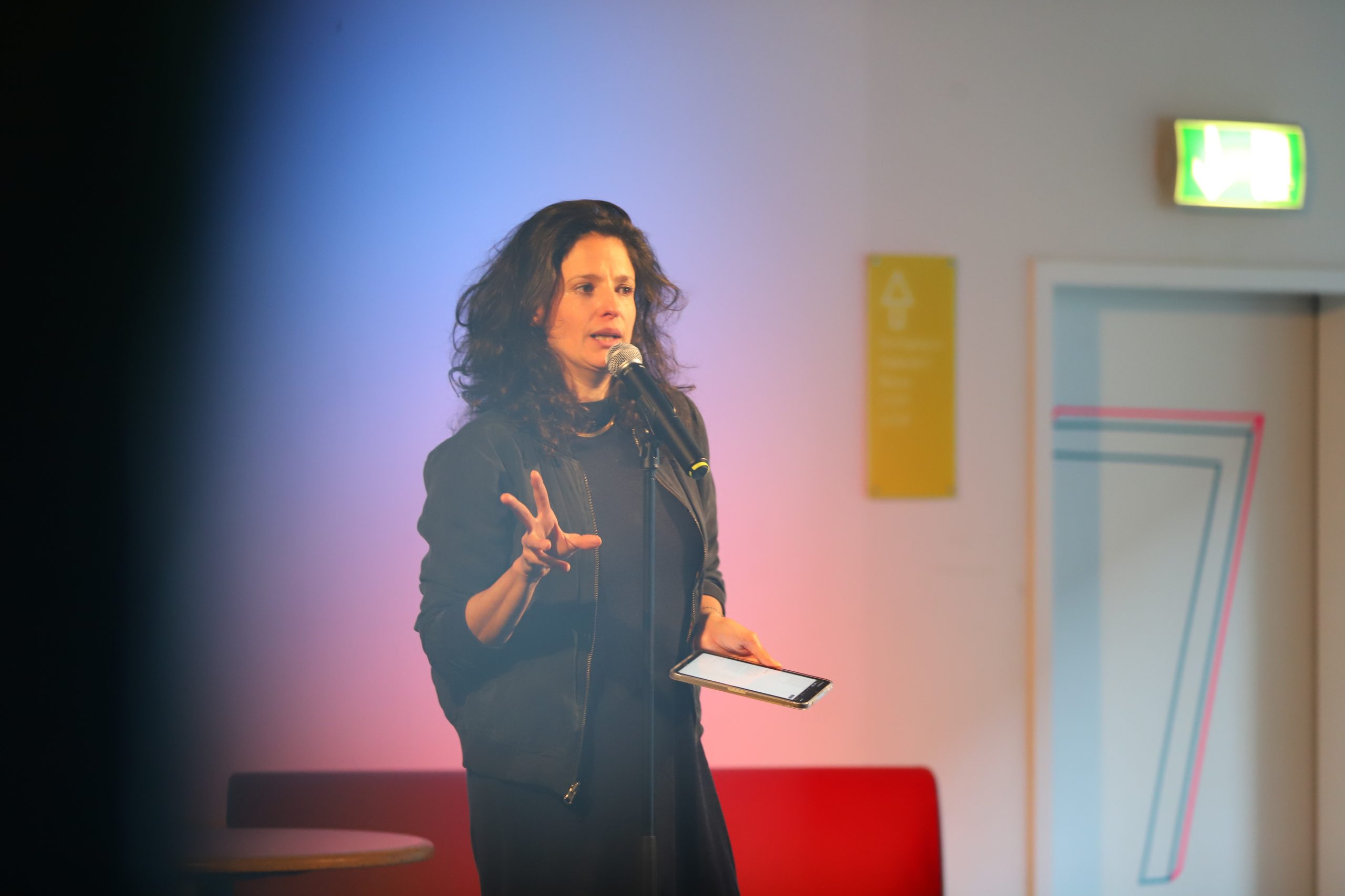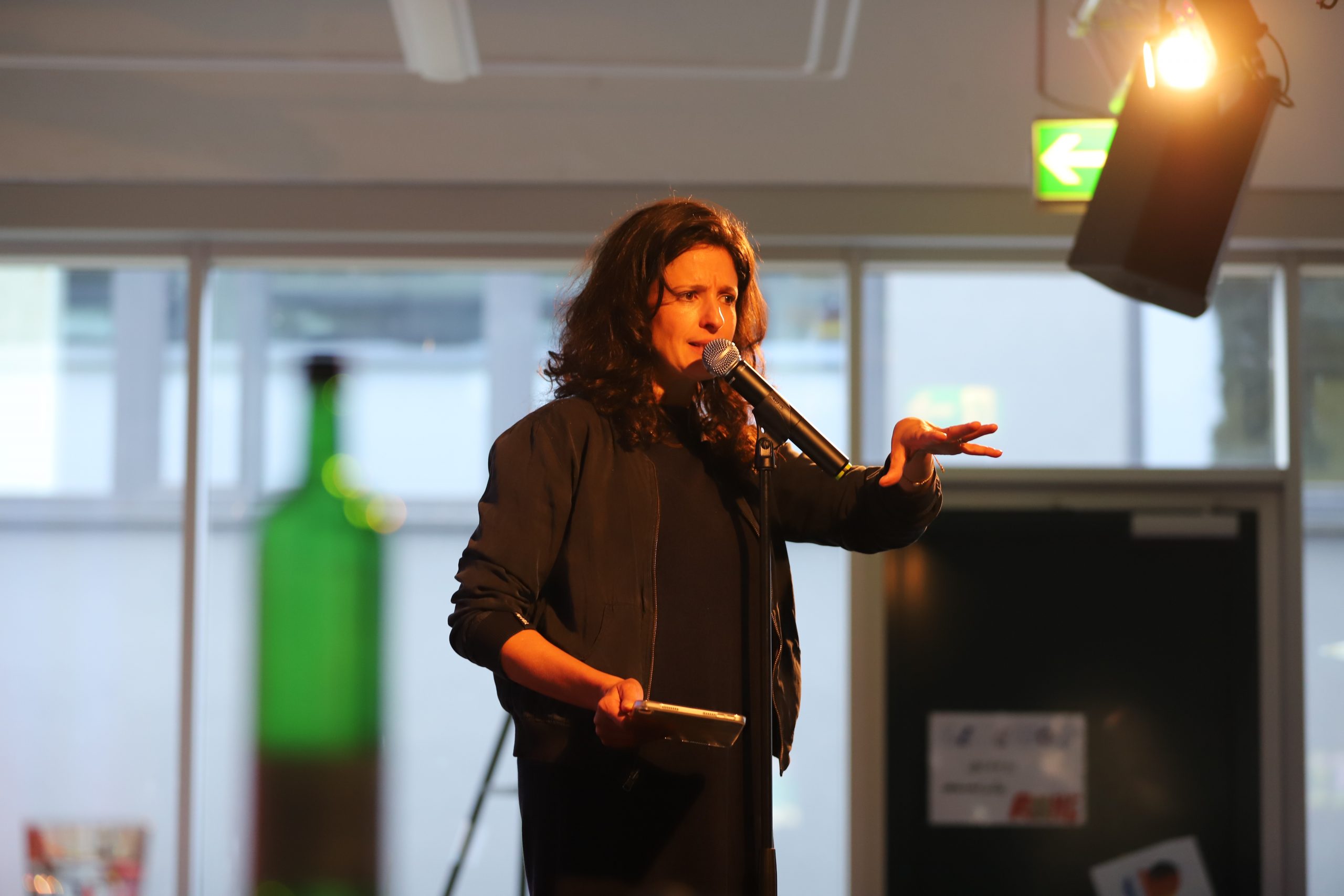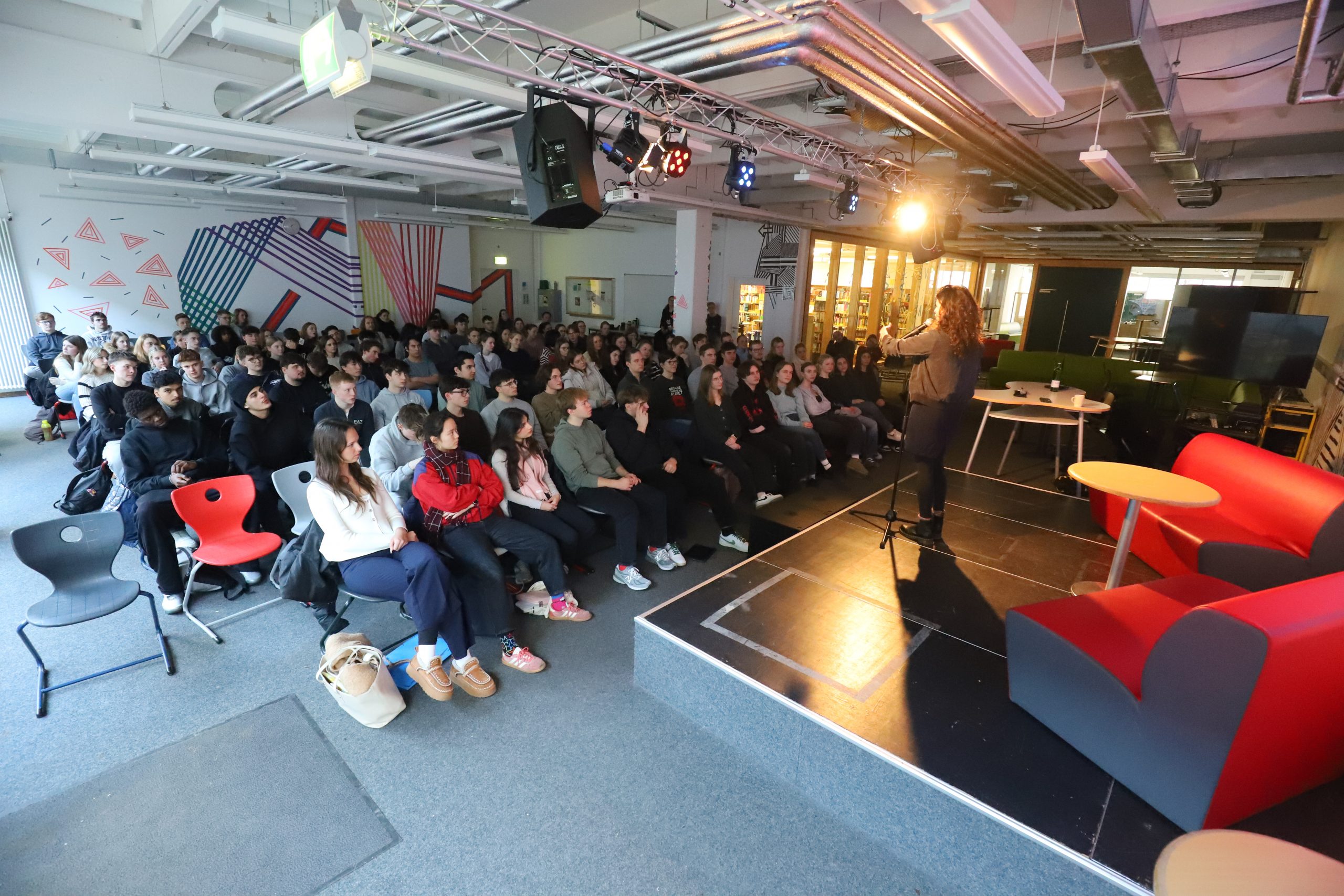 Festzulegen ist sie nicht, die Gedichterzählerin, Poetry-Slamerin, Dichterin, Poesie- Recorderin, … Sie ist deutschsprachige Poetry-Slam-Preisträgerin und hat zahlreiche Auftritte, zum Beispiel in der Elbphilharmonie und nun eben auch in der Lichtenberg-Schule. Sehr lebendig und persönlich berichtete sie zwischen dem Vortragen ihrer Texte über ihren Werdegang, ihre Erfahrungen und ihre Schwerpunkte. Dabei nahm sie immer wieder direkt Kontakt zum Publikum auf, ging auf Bemerkungen ein, beantwortete Fragen und stellte selbst Fragen, wodurch sich ein lebhafter Dialog bzw. wechselseitiger Austausch entwickelte.