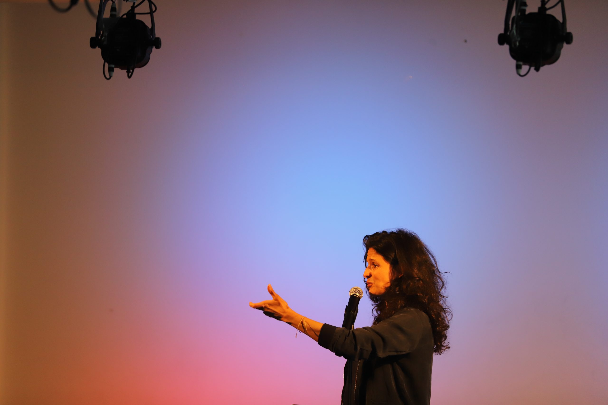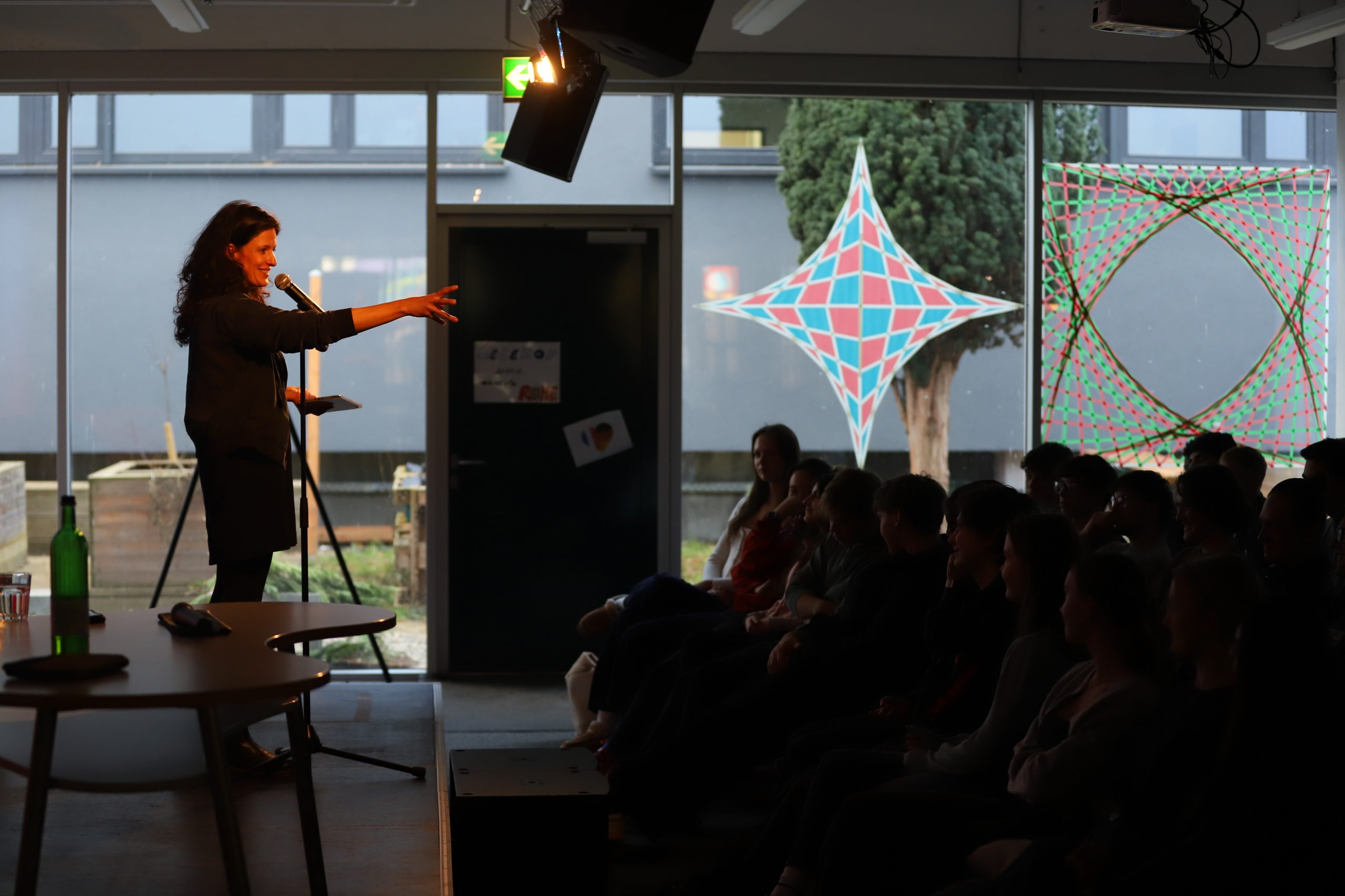 Begeisterung für Sprache – die „sprang“ vom Podium im wahrsten Sinne des Wortes über auf die Schülerinnen und Schüler der Oberstufe, als die Künstlerin Dominique Macri performte, rezitierte, vortrug, erzählte, … Vielseitigkeit im Umgang mit dem Medium Sprache wurde unmittelbar erlebbar.